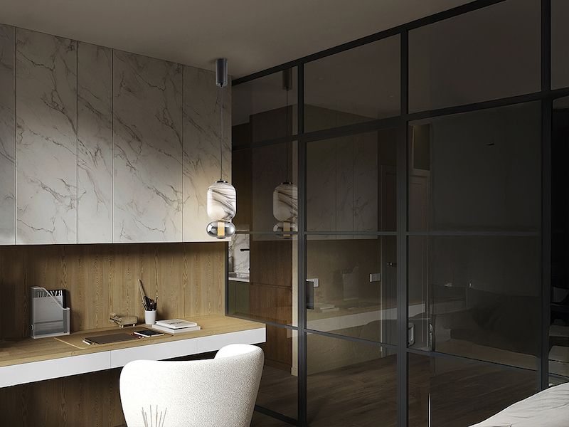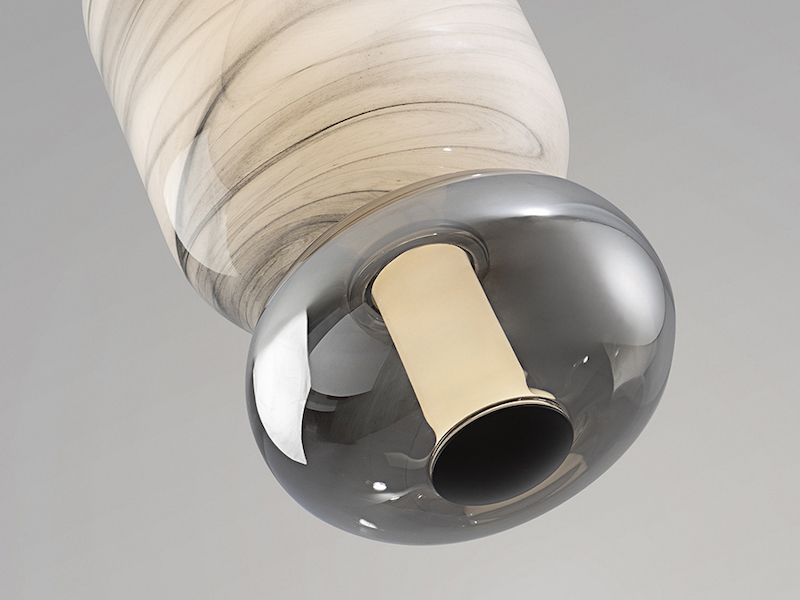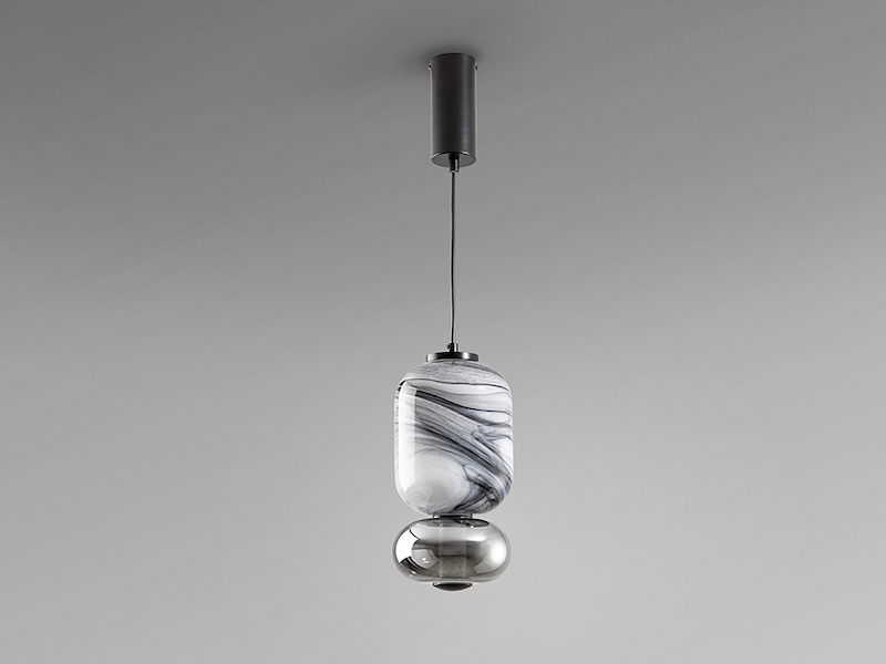 The Schuller Bianca single pendant is made of metal finished in matt black and is completed with glass lampshades in veined white and mirrored smoke. 10W LED, 3000K. 1,129 lumens.