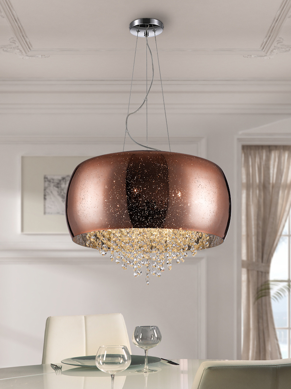 The stunning Schuller Caelum 6lt pendant is made of metal with a chrome finish. The blown glass shade is decorated in a shimmered copper colour with starry decoration effect. Completed with faceted crystal droplets inside.