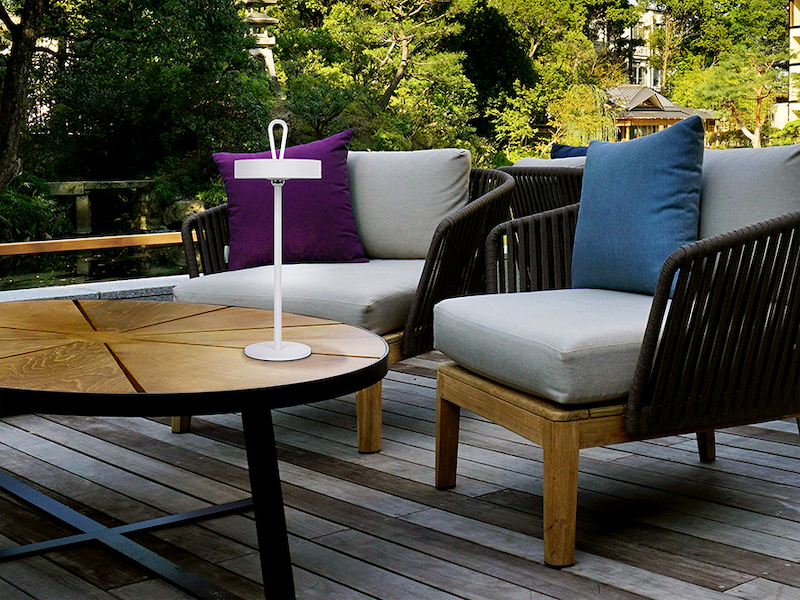 The Schuller Gong indoor and outdoor LED table lamp, is a portable shade with a silicone handle and magnet stand. A perfect, flexible light source, with no cables(!) for every occasion. Made of white finish metal and opal acrylic diffuser. 2.5W LED, 140 lumens, 3000K. DIMMABLE. IP54.