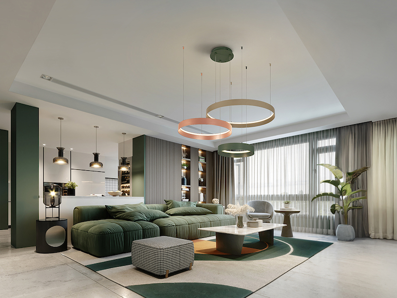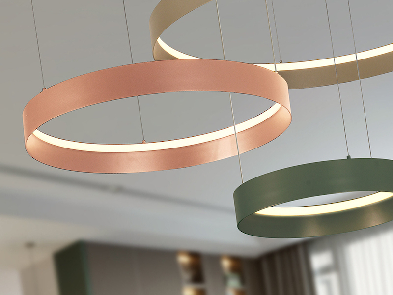 The Schuller Halos pendant is collection of 3 rings (Ø39, Ø58, Ø80 cm), made of aluminum and steel, finished in a matt pink, light brown and olive green paint. The rings are completed with opal diffusers. Height adjustable. 80W LED lighting, CCT: 2700-5000 K. 5100 lm. DIMMABLE. Remote control included.