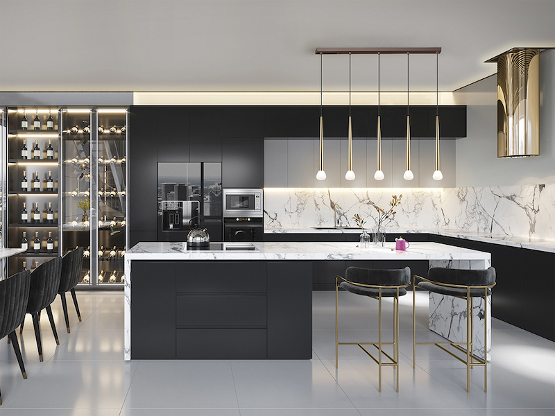 The Schuller Komet 5 light bar pendant is made of shiny gold and matt brown metal; completed with an opal tinted glass shades. Dimmable. Remote control included.