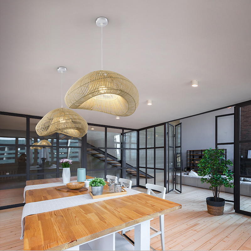 The Schuller Sabah pendant is made of metal with a rattan shade, in a natural finish. A perfect contemporary addition to any decor.