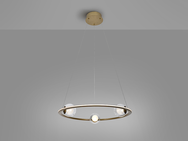 The Schuller Tirsa Lamp is made of steel and brushed aluminium, finished in anodic bronze. An opal silicone diffuser and three glass spheres, with opal interiors and clear exteriors, complete this statement pendant. DIMMABLE, 40W LED, 2700lm, 3000K. TRIAC driver and DIMMING SET included.